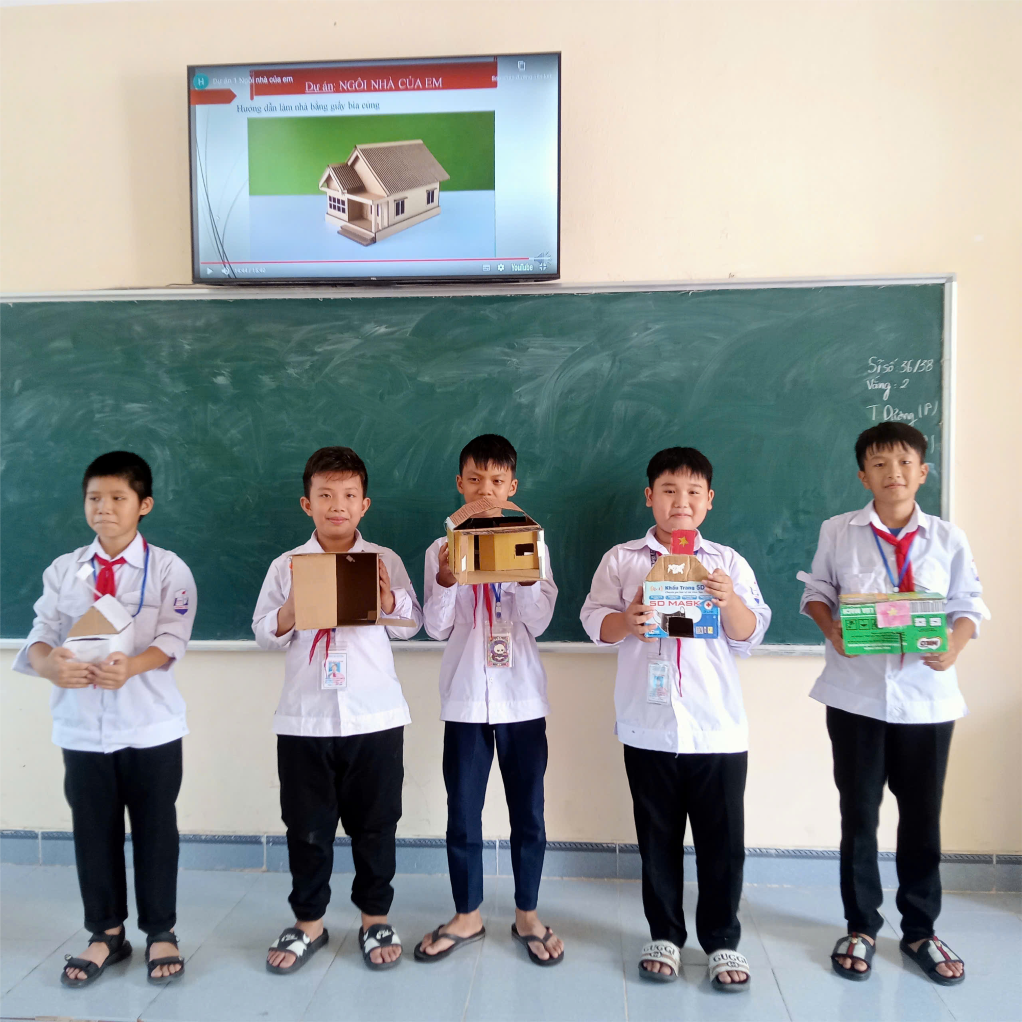 Dự án: Ngôi nhà của em. Học sinh thiết kế và lắp ráp hoàn thiện một mô hình ngôi nhà bằng vật liệu có sẵn trong gia đình. ( bìa, giấy màu, ống nhựa, trang trí đèn...)