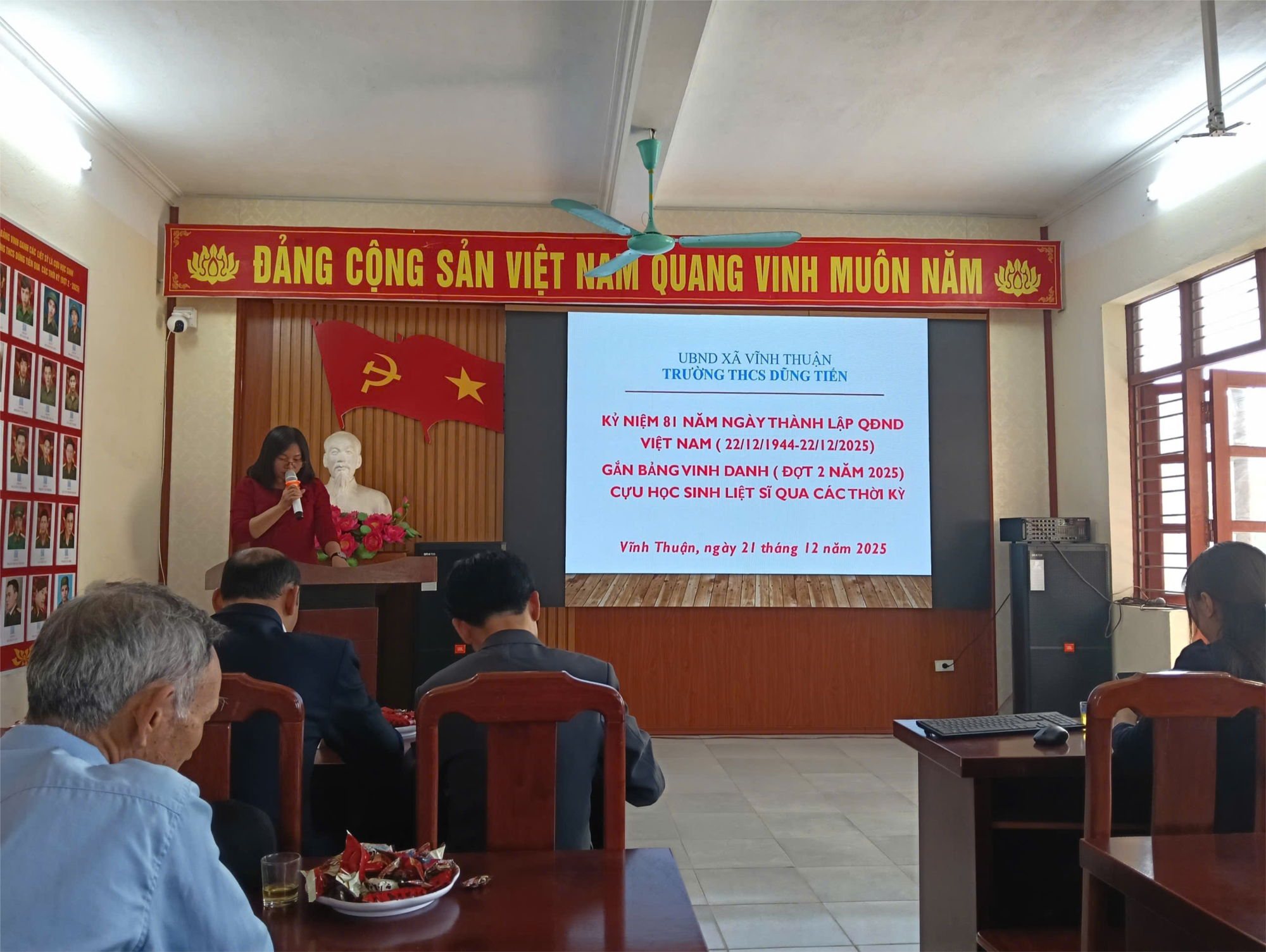 Nhân dịp kỷ niệm 81 năm Ngày thành lập Quân đội nhân dân Việt Nam (22/12/1944 – 22/12/2025), buổi lễ gắn bảng vinh danh đợt 2 các cựu học sinh liệt sĩ qua các thời kỳ của trường THCS Dũng Tiến được tổ chức trang trọng, thể hiện đạo lý “uống nước nhớ nguồn” của dân tộc.