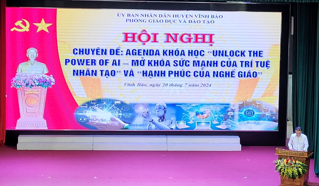 Căn cứ Kế hoạch số 576/KH-GDĐT và giấy mời số 577/GM-GDĐT ngày 16/7/2024 của Phòng Giáo dục và Đào tạo huyện Vĩnh Bảo về việc mời  dự Hội nghị chuyên đề: Agenda Khóa học “Unlock the Power of AI- Mở khóa sức mạnh của trí tuệ nhân tạo” và “Hạnh phúc của nhà giáo” (Thời gian: 01 ngày, bắt đầu từ 8h00 thứ bảy,  ngày  20/7/2024; Thành phần: Cán bộ giáo viên nhà trường). Lớp học được tổ chức: Tại điểm cầu trung tâm văn hóa Nguyễn Bỉnh Khiêm: Đc Nguyễn Văn Tịu, Đc Dương Xuân Lộc, Đ/c Nguyễn Minh Tuấn, Đc Bùi Văn Nhân, Đc Nguyễn Trọng Quảng, Đc Phạm Thị Thu Giang. Tại điểm cầu nhà văn hóa xã Dũng Tiến: Đc Nguyễn Thị Mận và toàn thể các đc giáo viên.