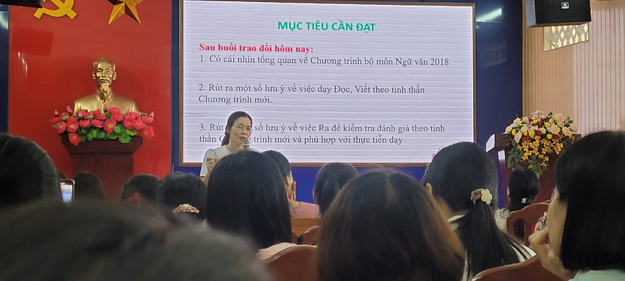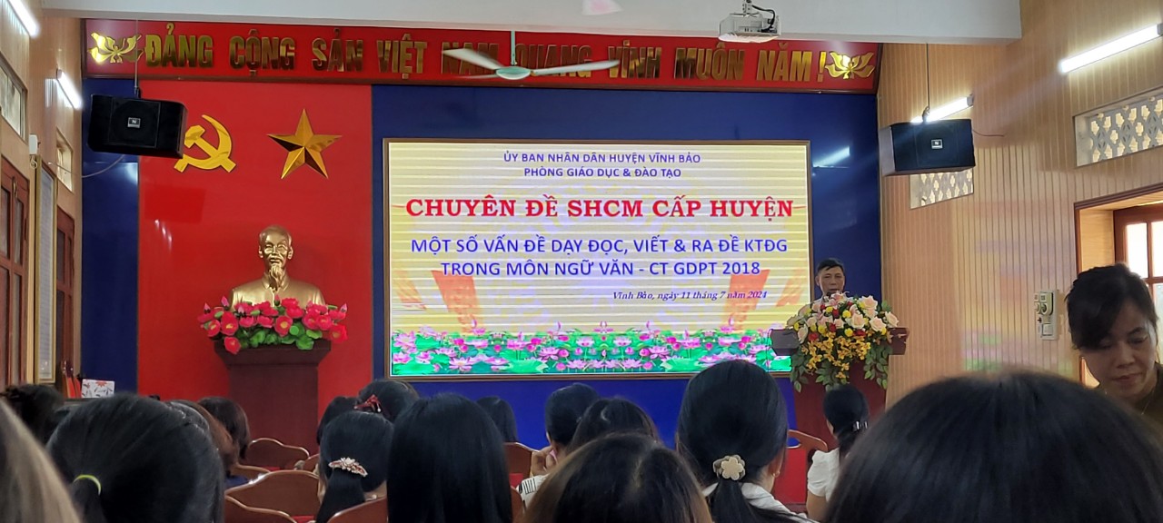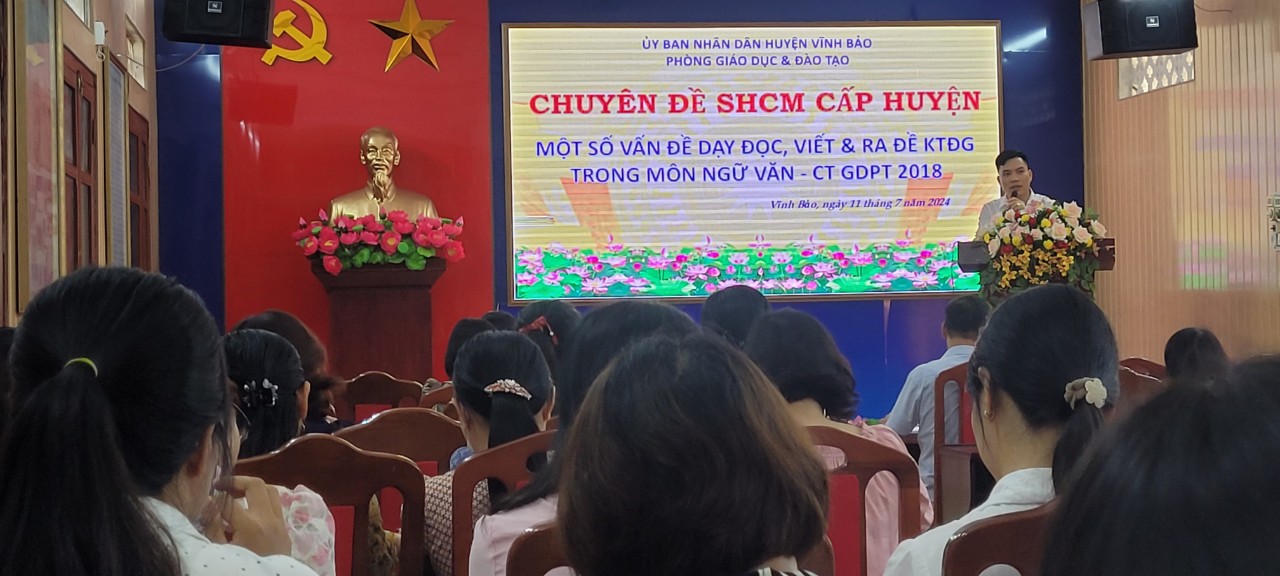 Thực hiện Công văn số 538/GDĐT ngày 28/6/2024 của Phòng Giáo dục và Đào tạo về việc hướng dẫn đổi mới phương pháp dạy học và kiểm tra đánh giá môn Ngữ văn cấp THCS năm học 2024-2025; Căn cứ kết quả quả đã triển khai thực hiện môn Ngữ văn theo Chương trình giáo dục phổ thông 2018 trong các năm qua và nhu cầu của đội ngũ giáo viên dạy môn Ngữ văn. Nhằm góp phần nâng cao chất lượng dạy và học môn Ngữ văn của các trường trên địa bàn huyện. Đồng chí Đặng Thu Hằng-Phó hiệu trưởng Trường THCS Đồng Minh- Trực tiếp báo cáo thực hiện Chuyên đề “Một số vấn đề dạy đọc, viết và ra đề kiểm tra đánh giá theo chương trình Giáo dục phổ thông 2018”, năm học 2024-2025. Chuyên đề được tổ chức tại Trường THCS Nguyễn Bỉnh Khiêm (vào sáng thứ 5/ 11/ 7/ 2024).Tổ Khoa học xã hội -Trường THCS Dũng Tiến có đồng chí Bùi Văn Nhân, Nguyễn Thị Hiển, Vũ Thị Thu Huyền tham dự, đồng thời cũng gửi báo cáo tham luận về chuyên đề trên.
